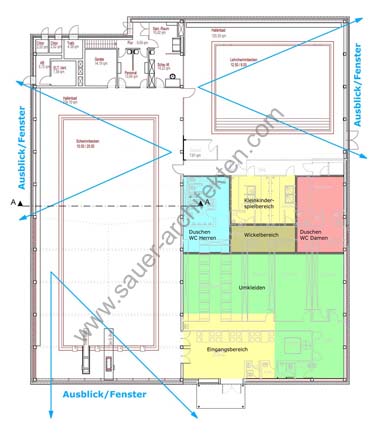 "Wohlbefinden" Neben den Grundvorrausetzungen wie ausreichend Luft und Wärme, die durch die Haustechnik bereit gestellt werden, ist für das menschliche Wohlbefinden die Sicherheit, Ruhe, Orientierung (Beleuchtung/Belichtung) von größter Wichtigkeit. Gerade die Orientierung ist beim Schwimmen von grosser Wichtigkeit. Das Fenster zur Umgehungsstrasse entfällt. Durch die 3 verbleibenden großen Fensterflächen ist immer der uneingeschränkte, direkte Blick nach draußen durch ein Fenster möglich - und durch mindestens ein zweites ein „schräger“ Blick und das Wahrnehmen von natürlichem Licht- durch diese zwei Bezugspunkte ist einem immer genau bewusst wo man sich befindet. Ebenfalls zur Orientierung gehört die uneingeschränkte Wahrnehmung des Wetters durch die Fenster („ist es schon Dunkel? Schneit es?“). |