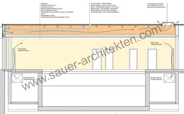Die nötigen Zu-/Ablüftkanäle der Lüftungsanlage werden in den Beckenumgang im Kellergeschoss verlegt. Aus-/Einlässe als Edelstahlsäulen. (zu sehen im Gebäudeschnitt) |
